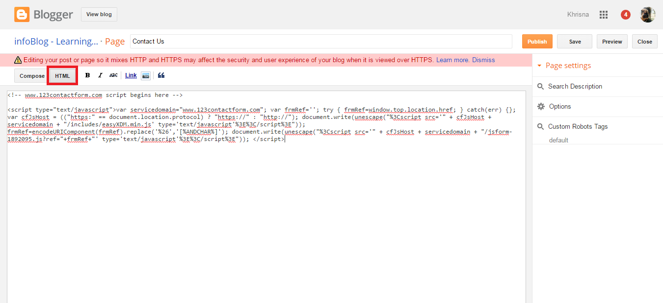 - Select HTML mode, then paste the HTML script code and don't forget to give the title of the page will be created.